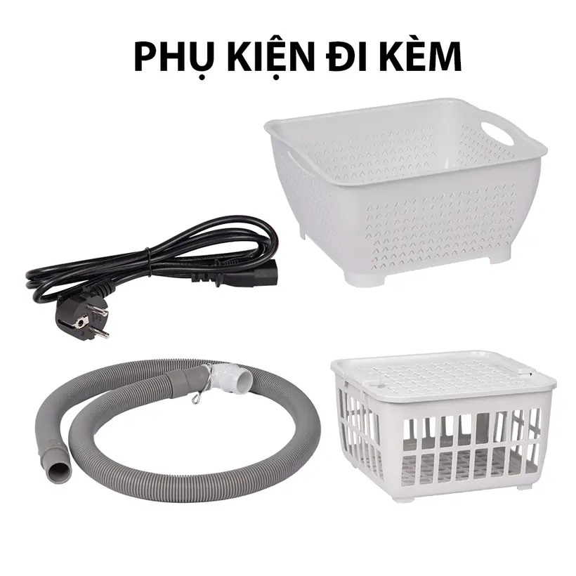 Bộ sản phẩm bao gồm: 01 máy rửa thực phẩm; 01 sách hướng dẫn sử dụng; 01 ống thoát nước; 01 khay rửa; 01 rổ; 01 dây nguồn.