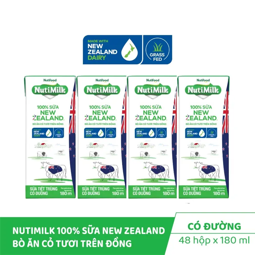 Thùng 48 hộp 180ml Nutimilk 100% sữa New Zealand bò ăn cỏ tự nhiên – Sữa tiệt trùng có đường